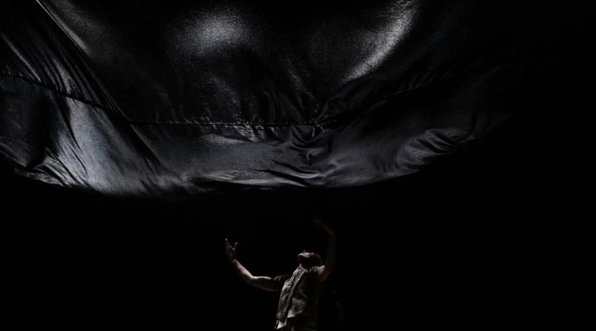 Le spectacle commence par une métaphore de la tempête avec juste un grand voile noir et une danseuse blanche (Chiara Michelini, admirable), qui jouent ensemble, la danseuse recouverte par moments par ce voile noir et brillant qui descend sur terre et l’enchevêtre.