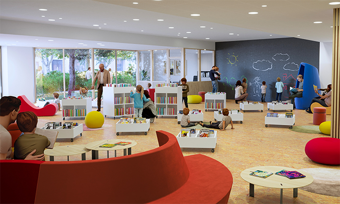 – Une bibliothèque métamorphosée, avec des espaces très diversifiés : espaces d’accueil, espaces de conférences et de spectacles de différentes tailles, espaces de détente, espaces d’exposition, ludothèque, espaces de travail en groupes, espaces d’écoutes musicales et de diffusion de l’image animée… Espaces et mobiliers modulables, conviviaux et ergonomiques.