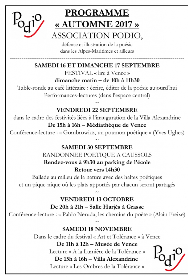 Par la force des choses, Podio s’est déplacée à Vence, où les poètes furent accueillis à bras ouverts. Même si son adresse légale est toujours à Grasse, l’association est toujours aussi active dans ses nouveaux quartiers. Ses avocats - Yves Ughes, Alain Freixe, Daniel Schmitt, Jean-Marie Barnaud, et beaucoup d’autres parmi lesquels on citera le nouveau jeune président Anthony Thibergen - multiplient les actions autour de René Char, d’Allan Ginsberg, de Gombrovitz. Ils convoquent aussi la peinture en associant poètes et artistes : Baudelaire et Matisse, s’ajustant à l’actualité, autour de Franta au moment même où le peintre exposait au château Villeneuve. On les voit à Vence, à Nice, à Mouans-Sartoux pendant le festival du livre. Et parfois, ils reviennent encore à Grasse dans leur souci de résistance.