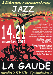 Samedi 19 novembre matin, sur le parvis du bas de la salle de La Coupole, à 11h30 : Apéritif musical gratuit avec l’Harmonie de La Gaude et Le Vin d’orange Gaudois ; Remise des récompenses du concours de dessin des écoles, du concours photo Jazz. Communication du lauréat des Trophées du Jazz de la Côte d’Azur.