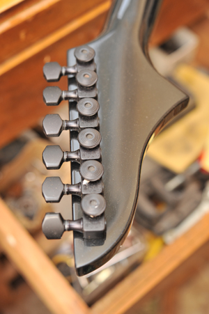 Entre des planches d’essences de bois précieux, une vieille guitare décortiquée, des plans sur papier millimétré et une caisse à outils géante, Kamel Chenaouy finalise sur son établi sa dernière création avec la minutie d’un joaillier. « Je travaille mes modèles de guitares comme des bijoux ». Entre ses mains, l’amarante et le bois d’amourette du corps tranchent avec le wengé et le palissandre utilisé pour les touches. « Regardez comme l’éclat du bois et du dessins des veines est révélé par le vernis ! »