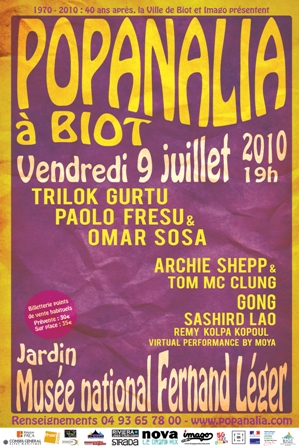 Soucieux d’adhérer à l’esprit de Popanalia 1970, David Benaroche, de l’association Imago Production, et le service évènementiel de la ville, ont bâti une programmation en adéquation avec le plateau de l’époque. Ainsi, Archie Shepp, présent lors de la première édition, revient à Biot, tout comme les membres du groupe mythique Gong. Et pour représenter la nouvelle génération, le fantastique trio world jazz Omar Sosa / Trilok Gurtu / Paolo Fresu ainsi que le trio de jazz vocal Sashird Lao, monteront sur la scène installée dans les jardins du musée national Fernand Léger.
