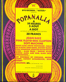 La première édition de Popanalia a lieu le 05 août 1970, avec à l’affiche les plus grands artistes rock de l’époque : Joan Baez, Pink Floyd, Eric Clapton, Gong, Soft Machine, les Moody Blues, et aussi du jazz avec Art ensemble of Chicago, Archie Shepp, Sonny Scharrock et Don Cherry…