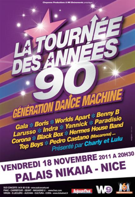 La tournée des années 90 accueillera la chanteuse GALA qui enflammait les dancefloors avec son tube ’Free from desire’ (96) CORONA et le fameux ’Rythm of the night’ (94) qui a squatté les Hit-Parades mondiaux, ainsi que LOS DEL MAR et son chanteur charismatique PEDRO CASTANO qui a fait un succès international de la ’Macarena’ (96). C’est aussi, le début du Hip Hop qui sera évoqué grâce à BENNY B et son célèbre ’Mais vous êtes fous’ (90).