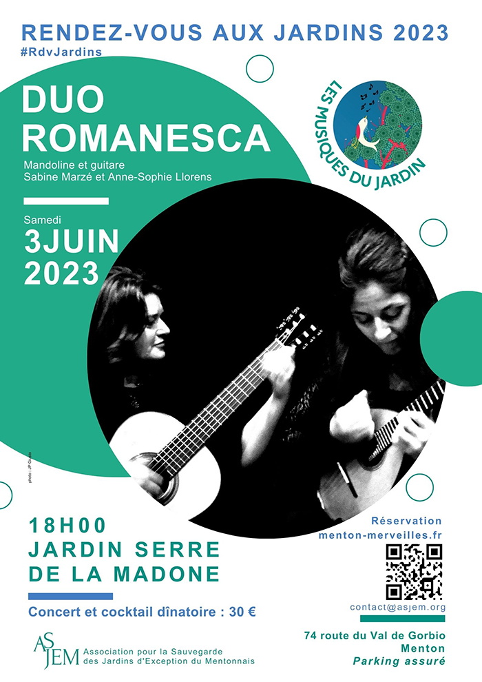 Le duo Romanesca, composé de Sabine Marzé et Anne-Sophie Llorens, est un duo poétique où la mandoline et la guitare s’expriment avec ferveur en exhalant des parfums venus des quatre coins du monde. Loin des clichés sur ces deux instruments dits « anciens ou classiques », le duo s’inscrit dans une délicate modernité. Avec grâce et énergie et d’une seule respiration, les jeunes femmes enveloppent l’auditoire et figent le temps. Tout en vous imprégnant de l’atmosphère enchanteresse du jardin, à la suite du concert, un cocktail dînatoire élégant vous sera proposé.