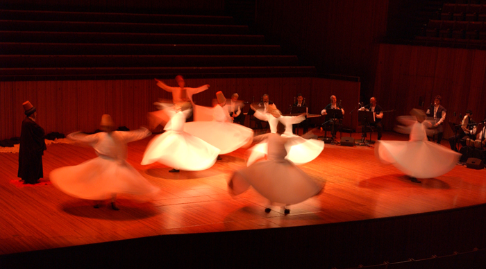 Istanbul Musica and Sema Group a été créé par R. Hakan Talu et porte ce nom depuis 1998. Cette formation s’est produite plus de 150 fois, dans 12 pays et sur 4 continents. Le spectacle est composé de musique mystique turque et de la fameuse danse des Derviches Tourneurs. Parallèlement, les musiciens et les solistes jouent également dans d’autres formations musicales du riche répertoire turque. Le rituel présenté évoque un appel à « l’amour humain », à la « fraternité » et à la « tolérance » en association avec le mysticisme de Mevlana Celaleddin-i Rumi qui parlait d’humanité en s’exclamant : « Venez ! Qui que vous soyez, venez ! ». La caractéristique la plus importante de ce rituel vieux de sept cents ans est celle de l’union entre les trois composants principaux de la nature humaine : la raison, l’amour et l’âme. La cérémonie, constituée de 6 parties, se termine par une lecture du Coran, une prière qui repose les âmes de tous les prophètes et des croyants, tirée de Sura Bakara 2, verset 115 : « Où tu regardes c’est le visage de Dieu que tu vois. Il tient tout dans ses bras, il connaît tout ».