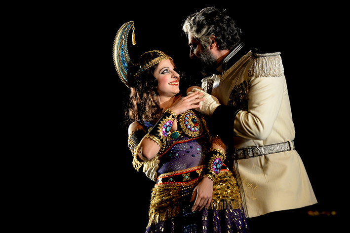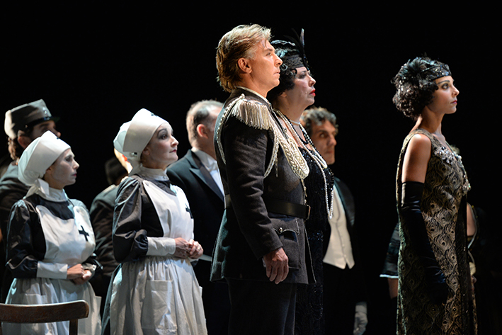 Afin de créer un parallèle avec ce mythe, Davide Livermore choisit de transposer la mise en scène à l’époque de la célèbre actrice et les costumes (signés Gianluca Falaschi) sont largement inspirés de la garde-robe de cette inoubliable comédienne. Certains personnages de moindre importance sont revêtus de tenues baroques et bariolés, joyeusement fantaisistes, qui donnent une tonalité très attractive au spectacle : un nain dans un rutilant costume et quelques choristes dans d’invraisemblables accoutrements pour circuler dans les coulisses du théâtre.
