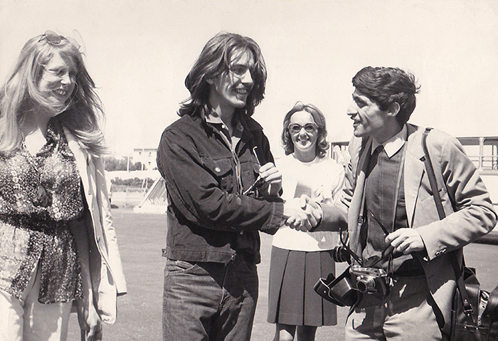 Sur le tarmac de l’aéroport, le photographe niçois s’arrange pour recroiser l’auteur de « While my guitar gently weeps » et n’a qu’une seule idée en tête, lui serrer la main. Afin d’immortaliser ces retrouvailles, Bébert a demandé à l’un de ses confrères de l’accompagner.