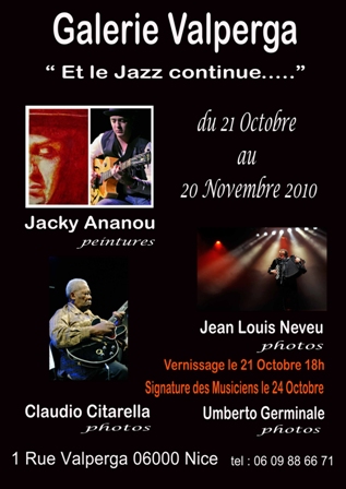 Après l’incontestable succès de l’exposition présentée dans le cadre du Nice Jazz festival 2010 au village VIP, une nouvelle exposition de Peintures et photos sur le thème du jazz se tiendra à la Galerie Valperga du 21 Octobre au 20 Novembre 2010..