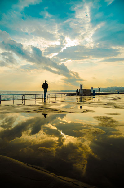 Il s’insinue dans la ville, prend des photos de gens de dos, juste un personnage qui passe, ou deux (il aime photographier des couples), rarement plus. il est intrigué par leur regard : Que voient-ils ? Il a plaisir à photographier « des gens normaux faisant des choses normales dans un paysage fabuleux » : des amoureux admirant une côte, un port, vus mille fois, mais toujours à redécouvrir, la lumière qui pénètre dans les petites rues menant à la mer, les arches ensoleillées, la Prom’, le vieux ponton (détruit il y a quelques semaines NDLR), le Plongeoir de La Réserve, etc., tout ce qui l’attire et le rend heureux.