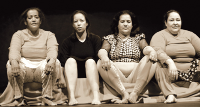 Dans la pénombre d’un cabaret marocain, Naïma, Fatima et Hliouti ont la voix éraillée et le corps écorché. Ce sont des Aïtas, ces femmes dont les incantations et la danse troublent tous ceux qui les regardent et les écoutent. Elles sont devenues des artistes du peuple, aussi adulées que méprisées, quand leur voix accompagne depuis la nuit des temps beuveries et mariages… Dans une œuvre tout à fait contemporaine, Bouchra Ouizguen, assise à leurs côtés sur les sofas, danse et chante avec elles sur le même tempo, la même cadence : un effleurement de la main, un déhanchement, un rire violent, un silence éternel, un coup de bassin, un sourire fugace. C’est lourd et léger à la fois, envoûtant, toujours tendu. Car le lien indicible qui les relie et les rassemble palpite au plus près de nous. À portée de main d’un coussin.
