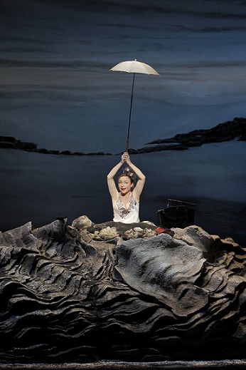 Winnie (Catherine Frot) pourtant dans la force de l’âge, se prépare déjà au lendemain, à la mort inexorable. Là est l’exploit par rapport à Madeleine Renaud, vieille dame à la scène et dans la vie. La Winnie, version 2012 de Beckett, respire la santé. Elle a l’art de se travailler l’esprit et de s’absorber dans le futile comme une fuite en avant. Son mari inexistant, Willy (Pierre Banderet) apparaît comme un crabe de terre rampant. L’écume des jours est pour l’héroïne matière à se distraire, à profiter de l’instant. Triche-t-elle avec elle-même lorsque qu’elle sourit, rit de tout, chante même L’Heure exquise qui résonne comme un Requiem ?