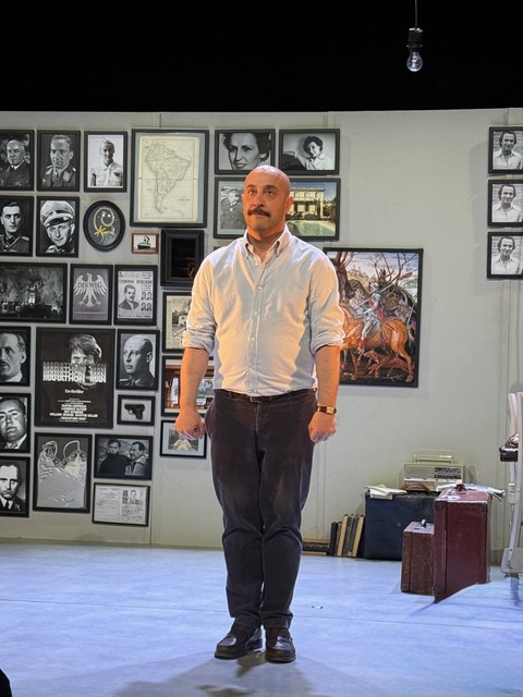 Sur scène, le décor est sobre. Sur le mur une multitude de cadres avec de nombreuses photos. Et sur le devant de la scène l’acteur qui débite son texte très vite comme s’il voulait s’en débarrasser, comme si raconter de telles horreurs devait être débitées rapidement…