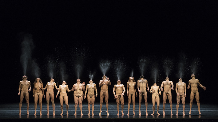 Le silence se fait parmi les spectateurs, tandis que les comédiens marchent en groupe au pas cadencé, avant de se dévêtir peu à peu déposant leurs vêtements devant le premier rang. Nus, sur le devant de la scène à proximité du public, ils cachent leur sexe de la main, et parfois le sexe d’un autre, ou ses yeux. Ils font face, mais la honte de la nudité apparaît. Leurs dos se voûtent pour signifier leur humiliation.