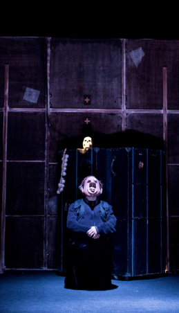 Trois comédiens allemands formés au mime et à l’expression corporelle. Ils portent divers masques semblant être des têtes de marionnettes auxquelles ils associent des gestes impeccablement adaptés. Aussi faut-il imaginer le travail fait en amont demandant de parfaits ajustements. Ces trois comédiens nous entraînent dans les coulisses d’un théâtre où s’agitent les techniciens avant et pendant les représentations.