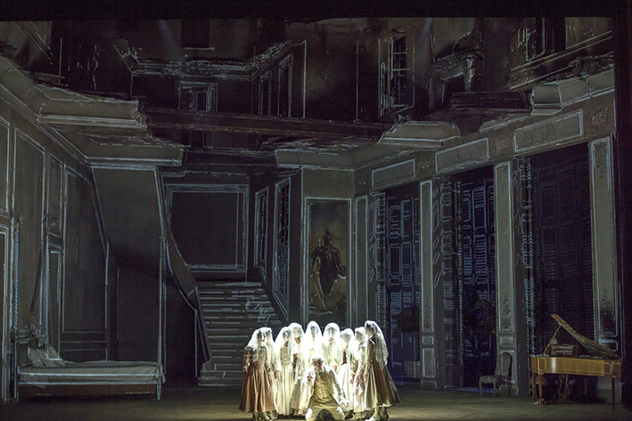 Tout commence dans le clair-obscur du château en ruine où le soleil passe entre les interstices de volets. A un sublime décor blanc signé Jean-Pierre Laporte, s’ajoute d’ingénieuses vidéos de Paulo Corréia, efficaces pour accentuer l’aspect décadent et fantomatique du lieu. Durant la musique d’ouverture, le vieux Chérubin s’installe au piano posé dans un angle de la scène et il se souvient...
