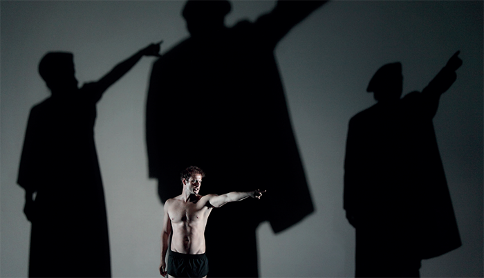 Hippolyte est seul en scène, vêtu uniquement d’un slip noir. Ses yeux brillent, écarquillés, horrifiés. Il clame le texte de Sénèque comme le feront tous les comédiens en l’articulant impeccablement pour nous rapporter les destins terribles de ceux qui ont osé désobéir aux lois ordinaires des hommes, des femmes et aussi des dieux.