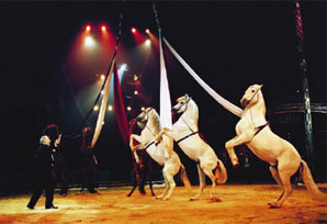 Suivant ces critères, le Comité d’Organisation a décidé d’engager les Frères GIONA (Italie) pour une présentation totalement renouvelée de chevaux en liberté. Plus qu’une présentation, c’est à un véritable jeu que se livrent les artistes, dont la complicité avec les chevaux, semble repousser, une fois encore, les performances des animaux. La musique, mystique, renforce le sentiment de plénitude atteint par les équidés.