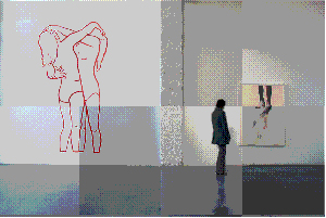 Issue d’une photographie du début du XXe siècle appartenant à l’histoire de la danse moderne, cette installation très graphique est réalisée au pinceau dans un style nettement inspiré des grandes compositions que Matisse exécute dans la dernière partie de sa vie. Le dessin mural qui joue avec la réserve blanche que forment les murs de l’ancien atelier de Matisse est ponctué de grandes aquarelles encadrées appartenant à la série « Tenir debout ». Ces travaux sur papier représentent là encore des cadrages sur des jambes de jeunes femmes dont l’ombre qui se projette au sol donne lieu à d’intrigantes taches informes. Tout se passe ici comme si on avait affaire à une succession de plans américains inversés où l’on verrait enfin ce qui d’ordinaire est rogné, en l’occurrence les jambes et les pieds des acteurs. Le dispositif n’est pas sans évoquer la mise en scène intitulée Pieds que Marinetti réalisa en 1915 pour le théâtre et qui ne laissait entrevoir que la partie basse du corps des acteurs et du mobilier.