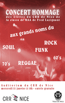 La classe de Musiques actuelles de Fred Luzignant au CRR de Nice est heureuse de vous inviter à son concert-hommage aux grands noms du Rock, de la Soul, du Funk et du Reggae : Mercredi 21 janvier à 18h