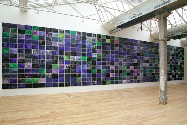 La Galerie contemporaine du musée est occupée par une installation de plus de 600 toiles de même format. Juxtaposés les uns aux autres, ces petits tableaux colorés rendent comptent de la mémoire d’un lieu, d’un événement ou d’une histoire et forment une banque d’images aux allures de scriptoria. A la préciosité et au caractère intimiste de cette scénographie répond la théâtralité des présentations du bord de mer. Les galeries des Ponchettes et de la Marine accueillent d’immenses bâches tendues sur châssis accrochées au mur ou simplement posées au sol sur des consoles de bois.
