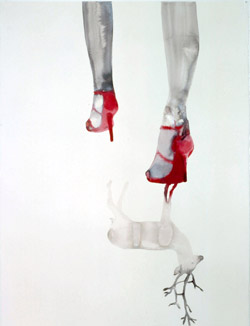 – Ces travaux sur papier représentent là encore des cadrages sur des jambes de jeunes femmes dont l’ombre qui se projette au sol donne lieu à d’intrigantes taches informes. Tout se passe ici comme si on avait affaire à une succession de plans américains inversés où l’on verrait enfin ce qui d’ordinaire est rogné, en l’occurrence les jambes et les pieds des acteurs. Le dispositif n’est pas sans évoquer la mise en scène intitulée « Pieds » que Marinetti réalisa en 1915 pour le théâtre et qui ne laissait entrevoir que la partie basse du corps des acteurs et du mobilier.