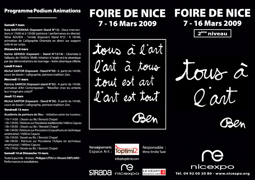 La Foire de Nice, NICEXPO a toujours eu comme objectif, depuis 1996 avec la création du salon d’art, la mise en valeur de l’art en vue de donner au maximum de personnes une opportunité de découvrir toutes les facettes de l’art. Pour la sixième année consécutive, NICEXPO organise, dans le cadre de la Foire de Nice au Palais des Expositions, tout un étage dédié à l’art. Cette année l’artiste Ben est l’invité d’honneur et c’est lui qui illustre le thème "tous à l’art" ! Un rendez-vous à ne pas manquer !