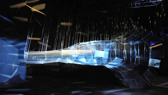 Mathias Delplanque est un artiste multi-facettes, à la fois compositeur, producteur, performer, improvisateur, concepteur d’installations sonores... Invité par Etienne Rey à intervenir sur son installation, Mathias Delplanque a répondu avec un échantillon sonore obtenu par le traitement d’un son de cloche. Son spectre audio a servi de référent graphique à Etienne Rey pour la construction de sa sculpture lumineuse, et ses diffraction, démultiplication et répétition sont à la base de la création sonore qui environne l’installation.