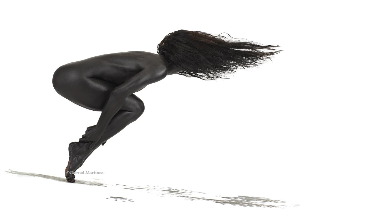 Lumière blanche qui habille le corps peint en noir du modèle et tente d’en révéler les nuances. Habilement, le corps noir s’évade dans une spirale des sens. Sans fin, le jeu du personnage échappe à nos repères, l’approche de l’artiste se détourne des conventions et canons usuels. Gabriel Martinez dévoile sa vision d’artiste au cours de ce stage photo. La pureté sera le leitmotiv de l’ensemble de l’oeuvre, maillon essentiel pour la compréhension de l’image.