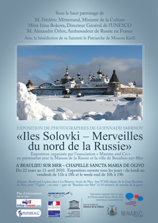 Dans le cadre des manifestations l’année croisée France-Russie, Beaulieu sur Mer accueille l’exposition photographique « ILES SOLOVKI – MERVEILLES DU NORD DE LA RUSSIE » : elle présente toute la beauté de cet endroit surprenant que constitue l’archipel des « Solovki », situé dans la mer Blanche arctique, à proximité du cercle polaire. A découvrir absolument !