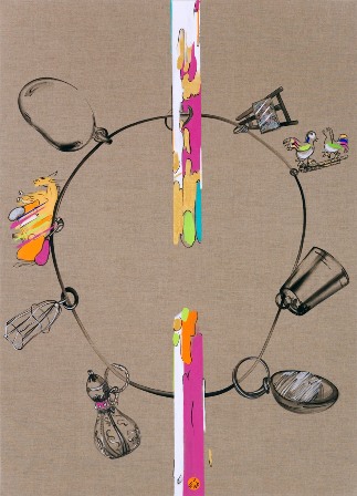 La composition dépouillée de ses toiles, l’utilisation du noir et l’objet isolé sur toile de lin brut apportent puissance aux formes et subliment l’objet. Dissociant parfois dessin et couleurs, l’artiste appose une bande de vibrations chromatiques, sorte de graffitis, comme un clin d’œil au sujet.