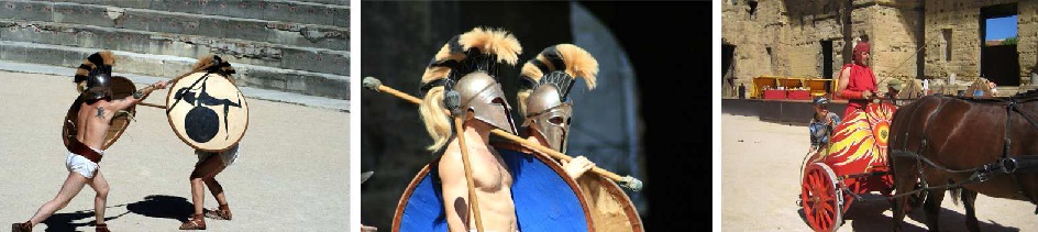 – 14h15 et 17h15 : Les gladiateurs combattent sur les chars romains (Aurige et Essédaire).