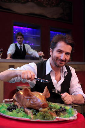 Le manque de succès oblige une troupe de comédiens à transformer une salle de théâtre vide de spectateurs en une salle de restaurant pleine de dîneurs…