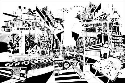 D’amorces de récits autour de distorsion, d’assemblages, de recomposition de lieux et d’aventures, naîtront des paysages architecturaux, urbains et maritimes comme des emblèmes compagnes de mes mythographies." (Chourouk Hriech)