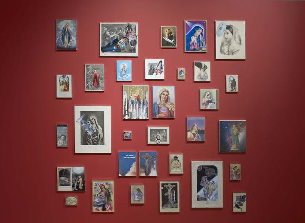 – Un peu plus loin, l’aspect plus "spirituel" de l’exploration spatiale, ces résurgences d’un vieux mysticisme religieux russe, s’exprime par les collages d’Aleksandra Mir. On y voit des icônes mystiques couplées de représentations de vaisseaux spatiaux soviétiques.