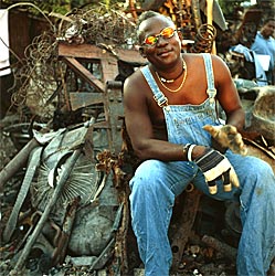 Ces artistes formant le groupe "Atis Rezistans", étaient composé de trois seniors : André Eugène, Jean Hérard Celeur etFrantz Jacques, connu sous le pseudonyme de Guyodo. Ils travaillaient alors dans la Grand Rue, ce dédale de garages en folies servant -accessoirement- d’ateliers d’artistes. Châssis rouillés, volants et moyeux, vilebrequins cassés et autres filtres troués...Avec l’aide de jeunes assistants, ils transformaient ces débris industriels en d’immenses figures dignes du jugements derniers, dotées de corps aux difformités effrayantes. Et dont les têtes n’en restaient pas moins cauchemardesques : de grands crânes humains faits de plastiques achevaient de faire de ces œuvres des créations morbides et totalement originales.