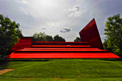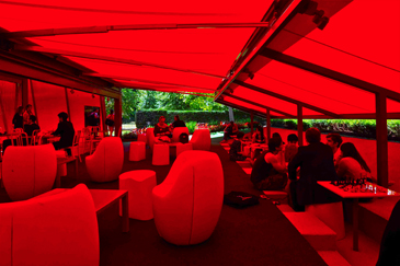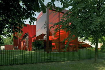 Car regardons-y de plus près : avec ses auvents rétractables, son auditorium modulable, ses lourdes charpentes métalliques, son mursignal oblique de douze mètres de haut, l’idée de l’architecte est de jouer sur les contrastes de couleurs et de matières : entre le totalement rouge de la construction et le vert des jardins, entre la légèreté du polycarbonate et du verre et la pesanteur des structures métalliques. De ce point de vue, c’est plutôt réussi et le pavillon ne laisse pas indifférent, bien que l’imposante et imposée couleur ne provoque pas forcément l’envie de séjourner dans l’ambiance hallucinogène qu’elle installe : rouge à s’enivrer, du caoutchouc de sol à la toile des vélums qui l’abritent en passant par le mobilier.