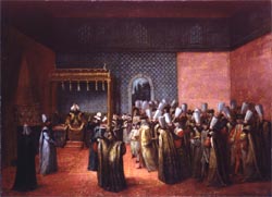 Jean Baptiste Vanmour (1671-1737)Réception de l’Ambassadeur de France, le vicomte d’Andrezel, par le Sultan Ahmed III, 1724. Bordeaux, musée des Beaux-Arts © Cliché du M.B.A. de Bordeaux / Lysiane Gauthier. Fasciné par les paysages des rives du Bosphore, par les fastes de la Cour des sultans ou par le mélange cosmopolite des peuples de l’Empire ottoman, Vanmour offre, à travers sa peinture, un témoignage rare de la vie à Constantinople au XVIIIe siècle.