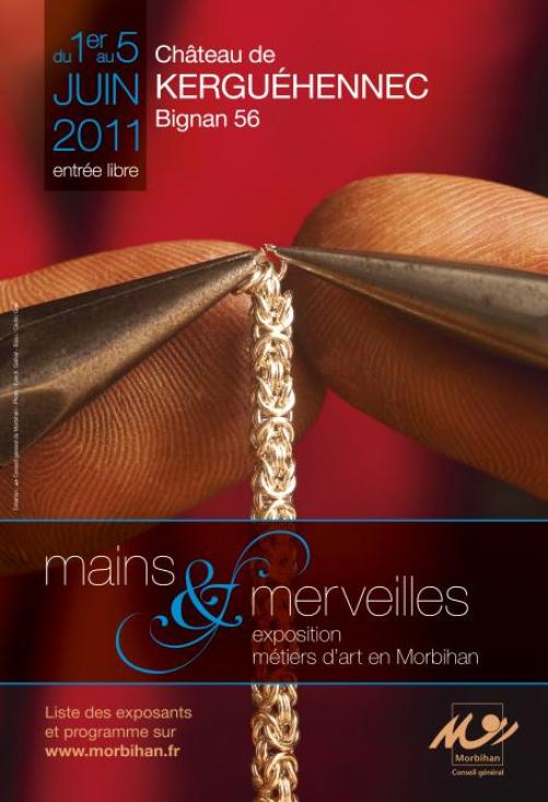 Après le succès de l’édition 2009 au Château de Kerguéhennec (plus de 16 000 visiteurs français et étrangers en 5 jours) et d’une formule itinérante l’été dernier au sein même des ateliers d’art du Morbihan, l’exposition vivante « Mains & Merveilles » investit à nouveau le Domaine de Kerguéhennec situé à 30 kilomètres au nord de Vannes. Une formidable occasion pour les amateurs, passionnés, touristes et nombreux chineurs de rencontrer une quarantaine des 660 professionnels des métiers d’art du Morbihan aux savoir-faire uniques. Bijoutiers, verriers, ébénistes, vitraillistes, sculpteurs, peintres, graveurs, couteliers, potiers, forgerons... transmettront leurs passions à travers démonstrations (taille de la pierre, sculpture sur bois, forge coutelière, poterie et cuisson raku, lithographie, gravure...) et animations pour « petits et grands ».