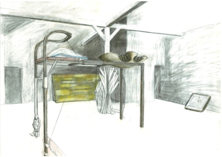 Épurée, cette structure devient un contenant contenu, support d’objets rapportés. On y trouve ainsi un objet existant, un skydôme, ainsi que des formes fabriquées, un gros coquillage de grès, un store de lamelles, une paroi de bois sur laquelle apparaissent des formes délavées, traces d’objets aujourd’hui disparus.
