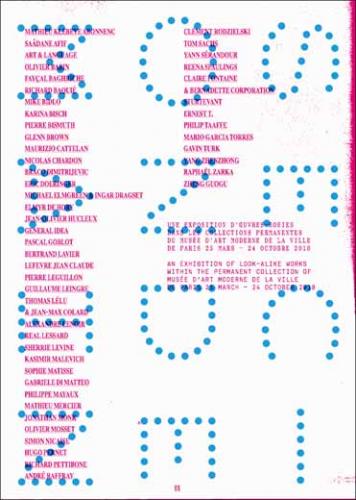 Mathieu Klebeye Abonnenc, Saâdane Afif, Art & Language, Olivier Babin, Fayçal Baghriche, Richard Baquié, Mike Bidlo, Karina Bisch, Pierre Bismuth, Glenn Brown, Maurizio Cattelan, Nicolas Chardon, Braco Dimitrijevic, Eric Doeringer, Michael Elmgreen & Ingar Dragset, Elmyr De Hory, Jean-Olivier Hucleux, General Idea, Pascal Goblot, Bertrand Lavier, Lefevre Jean Claude, Pierre Leguillon, Guillaume Leingre, Thomas Lélu & Jean-Max Colard, Alexandre Lenoir, Real Lessard, Sherrie Levine, Kasimir Malevitch, Sophie Matisse, Gabriele Di Matteo, Philippe Mayaux, Mathieu Mercier, Jonathan Monk, Olivier Mosset, Simon Nicaise, Hugo Pernet, Richard Pettibone, André Raffray, Clément Rodzielski, Tom Sachs, Yann Sérandour, Reena Spaulings, Claire Fontaine & Bernadette Corporation, Sturtevant, Ernest T., Philip Taaffe, Mario Garcia Torres, Gavin Turk, Yang Zhenzhong, Raphaël Zarka, Zheng Guogu