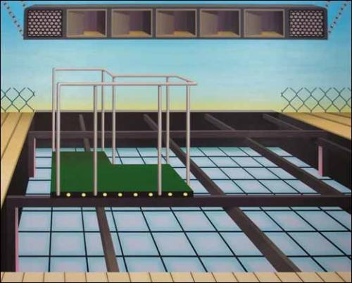 – Une entreprise considérable, à laquelle cette jeune peintre s’engage à répondre par la lenteur et la minutie, pour le moins déterminées, du processus d’élaboration. Les tableaux sont de véritables constructions, à la fois de formes et de couleurs. Il semble en premier lieu difficile d’en dire davantage tant ces éléments, qui ne restent reconnaissables que par leur forme, ont été évidés de leur contexte. Pour le moins dérouté, le spectateur croit déceler la présence d’une rampe de skate, les murs crénelés d’un château peut-être, un drapeau hissé encore.
