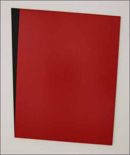 – Pour sa deuxième exposition à la galerie, Jan Kämmerling, jeune artiste de Düsseldorf, explore un thème caractéristique dans son travail : la déstabilisation du regard, obtenue par un jeu d’obliques, à la fois dans la forme du châssis et dans les aplats de couleurs. Fidèle à cette démarche, une grande peinture trapézoïdale (160 de hauteur sur 500 cm de large), recouverte uniformément, sur presque la totalité de sa surface, d’une couleur rouge, est bordée d’une fine bande triangulaire noire, sur sa droite – bordure biaisée – qui va déterminer l’axe vertical du tableau. Ainsi, pour l’accrochage, le tableau tout entier va basculer suivant un angle de 6° donnant ainsi l’impression d’une composition instable.