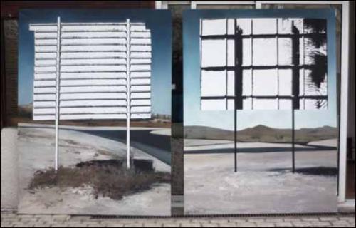 – Réalisées dans l’atelier d’après motif — là où l’artiste prend des photographies (Sud de la France et de l’Espagne), dessine sur son carnet (aires de jeux de la région parisienne), assemble ensemble des images trouvées (photographies de presse) — ces peintures sont le résultat d’un patient travail de composition et d’esquisses où les différents glacis, couleurs et aplats sont indiqués et précisés, où les zones sérigraphiées tout comme les effets de matière sont clairement délimitées à l’avance. Vues ensemble, elles forment un paysage éminemment contemporain où notre oeil aura tôt fait de reconnaître « non-lieux » et territoires en devenir d’avoir déjà trop