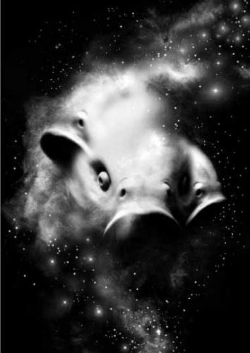 – Et, comme la mise en scène nous le suggère, ici le regard prévaut : le regard triple d’un éléphant grandeur nature, les yeux bleus de mutants génétiquement modifiés par l’Homme, tout nous pose question et les rôles s’inversent dans cette contemplation abîmée : nature rêvée ou nature enfouie ? Avenir prophétisé ou passé ressuscité ? Qui est bourreau et qui est victime ? Qui est chasseur et qui est gibier ? Est-on là pour sourire et s’amuser ou pour trembler et se faire dévorer ? Doit-on sauver ces êtres informes ou abréger leurs souffrances ?