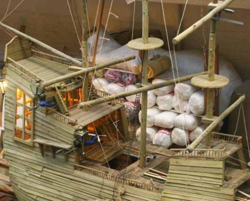 – « C’est une caravelle de cinq mètres de long et de haut, une sculpture de bateau en bois et en corde, s’accompagnant d’un stock de nourriture et de produits divers, assiettes, cuvettes et corde... Une réalité construite au-dessus de l’autre, avec ses propres lois, en bois autoclave pour résister à l’eau. Un navire maquette qui oscille entre deux échelles, un grand modèle réduit ou une barque améliorée. Flottant sur les deux logiques, son accastillage est aussi utile que les stocks de nourriture qui sont entreposés à ses côtés. Le bateau comme attente, éclairé, quand tout l’équipage se réunit sur le pont. Les logiques du jeu et l’imagination pour force motrice. Un parcours de la sculpture comme envisageable, imaginable, avec haubans et plates-formes. Habitable par un mini équipage et un capitaine géant. Guidé et gardé par de petits matelots. Les uns transportent et utilisent l’autre, ou le contraire. Le navire est un voyage en lui-même, une expérience de la construction, l’invention d’un édifice personnel. La solitude du maquettiste et son optimisme naïf. Comme un bateau domestique au milieu du salon. » Vincent Olinet