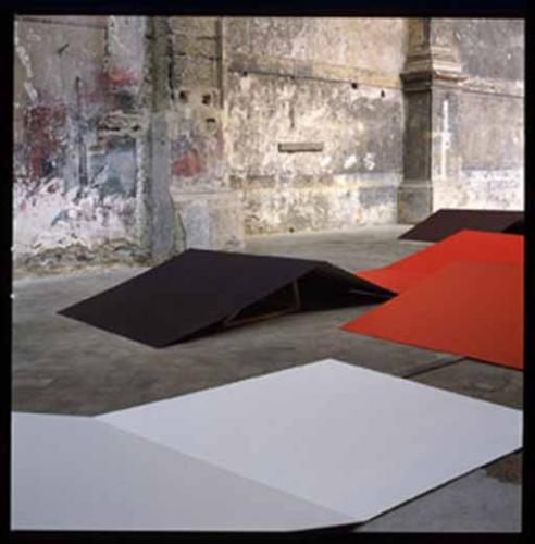 – Que les tableaux de Callum Innes présentent une image non-figurative et irrégulière qui est le fantôme subsistant après que les couches épaisses qui recouvraient intégralement la surface ont été enlevées par dilution à la térébenthine, le tableau se faisant en se défaisant.