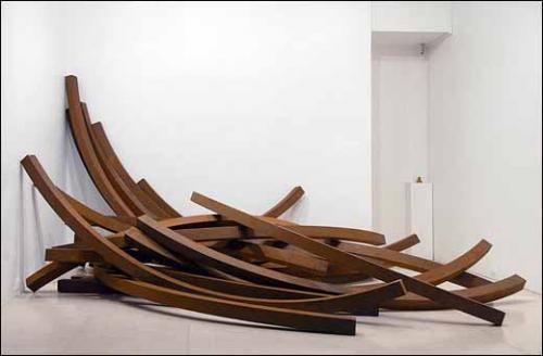 – Avec une sobriété de moyens, c’est sa manière de réagir brutalement à l’académisme du carré, du cube ou du monochrome, cet héritage légué par Malevitch ou Mondrian et qui, selon l’artiste, « s’essouffle paresseusement dans son énième variation, dans sa croyance aveugle en un ordre idéal ». Cette installation est composée de vingt-quatre arcs en acier Corten. Ces arcs que l’on retrouve de manière récurrente dans l’œuvre de l’artiste sont ici présentés comme abandonnés, entremêlés dans un désordre chaotique, faisant suite à un événement imprévu, celui d’une désintégration, d’un « effondrement ».