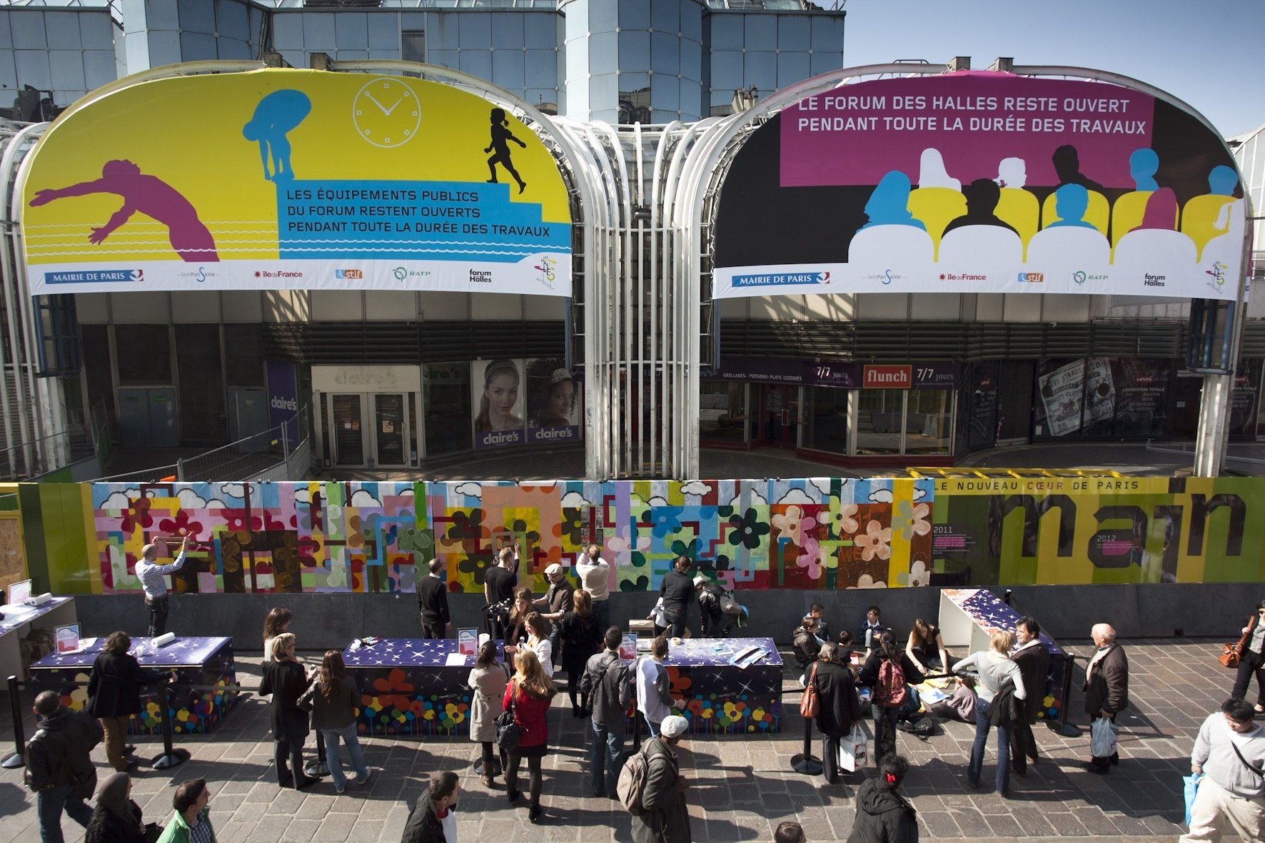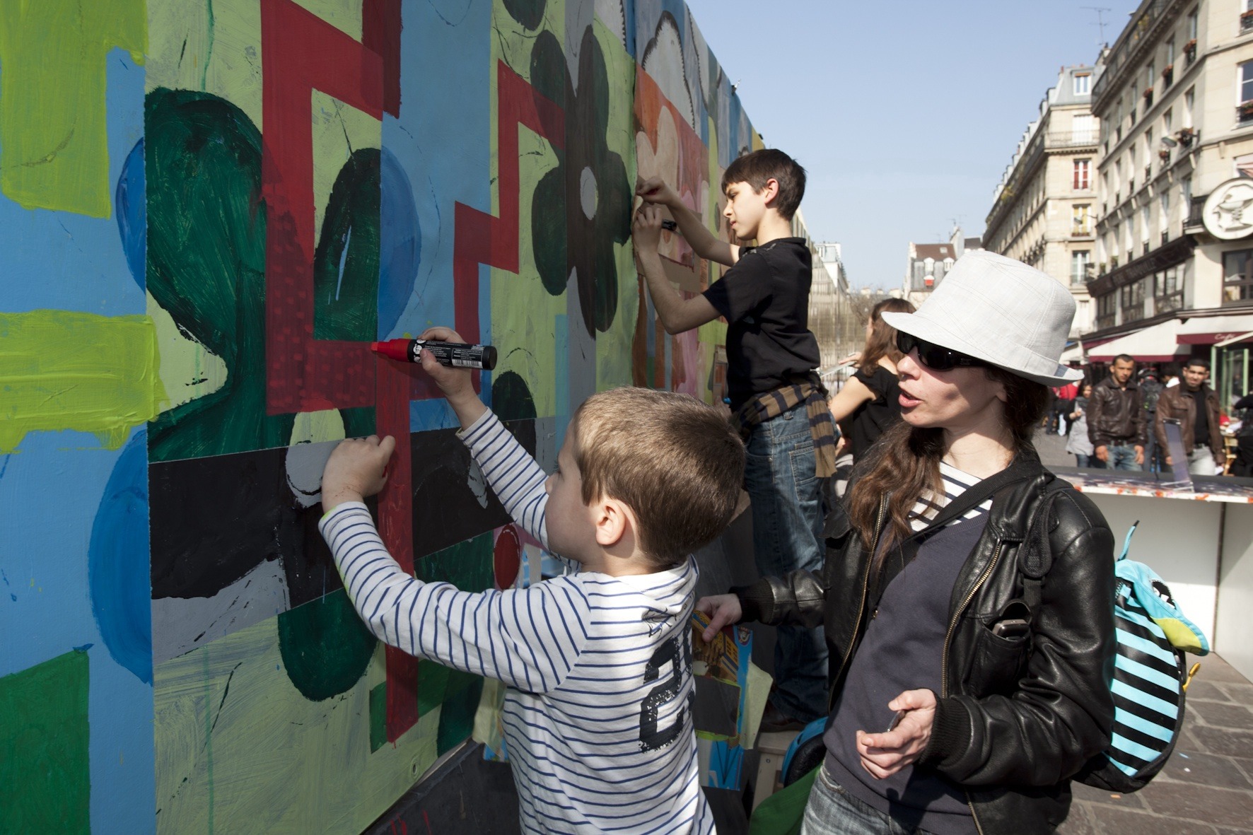 De 13h à 15h30, une centaine d’artistes d’un jour ont participé - aux côtés du peintre contemporain Pierre Bendine-Boucar - à la réalisation d’une fresque collective géante sur le thème du printemps. Cette oeuvre, intitulée "Colorama Flowers" inaugurait les palissades installées sur le pourtour du centre, marquant un premier pas vers le renouveau des Halles.