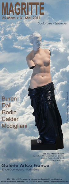 A noter que l’exposition s’est enrichie d’une sculpture Originale en Bronze peint et patiné de Magritte « Les Menottes de Cuivre », d’une hauteur de 2m20, réalisée d’après le plâtre peint par René MAGRITTE en 1931, sur un moulage de la Vénus de Milo, Musée du Louvre, Paris.